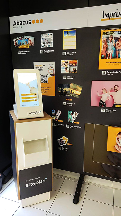 Esta tecnología permite a grandes cadenas como Abacus Cooperativa ofrecer un servicio personalizado de impresión a sus clientes y, al mismo tiempo, sacar un rendimiento extra a sus instalaciones gracias a distintos factores. Por un lado, la gestión autónoma del cliente ya que son los mismos clientes quienes ejecutan todo el proceso de personalización y compra. Por otra banda, se requiere de poco espacio físico dentro del establecimiento para tener operativo el kiosko impresor.